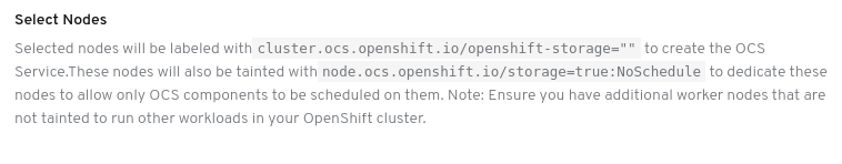 cluster.ocs.openshift.io/openshift-storage=""we are letting the users know about these changes in the nodes. These nodes will also be tainted withnode.ocs.openshift.io/storage=true:NoSchedule. However, since the previous explanation was ambiguous the updated statement lets the user know that these taints have been added to schedule only OCS components and nothing else. It also lets the user know that they should have other additional nodes that are not tainted so that there are nodes where the other workloads can be scheduled.Screenshot: