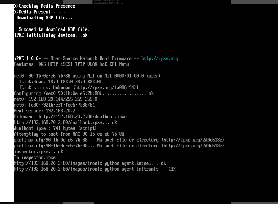 As we can see from the PXE startup interface, the MAC address for the host is correct, inspector.ipxe is used because there is no corresponding file in the pxelinux.cfg folder. We can see that the pxelinux.cfg folder is empty in bootstrap. FYI, here is the content of the tftpboot folder: |