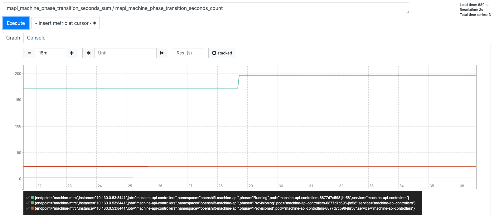 Provisioning,Provisioned,RunningorFailed. This will allow us to calculate, for example, what the average creation time for a Machine is and see which phases are particularly slow.Eg, the average time it took for a machine to enter each of these phases: