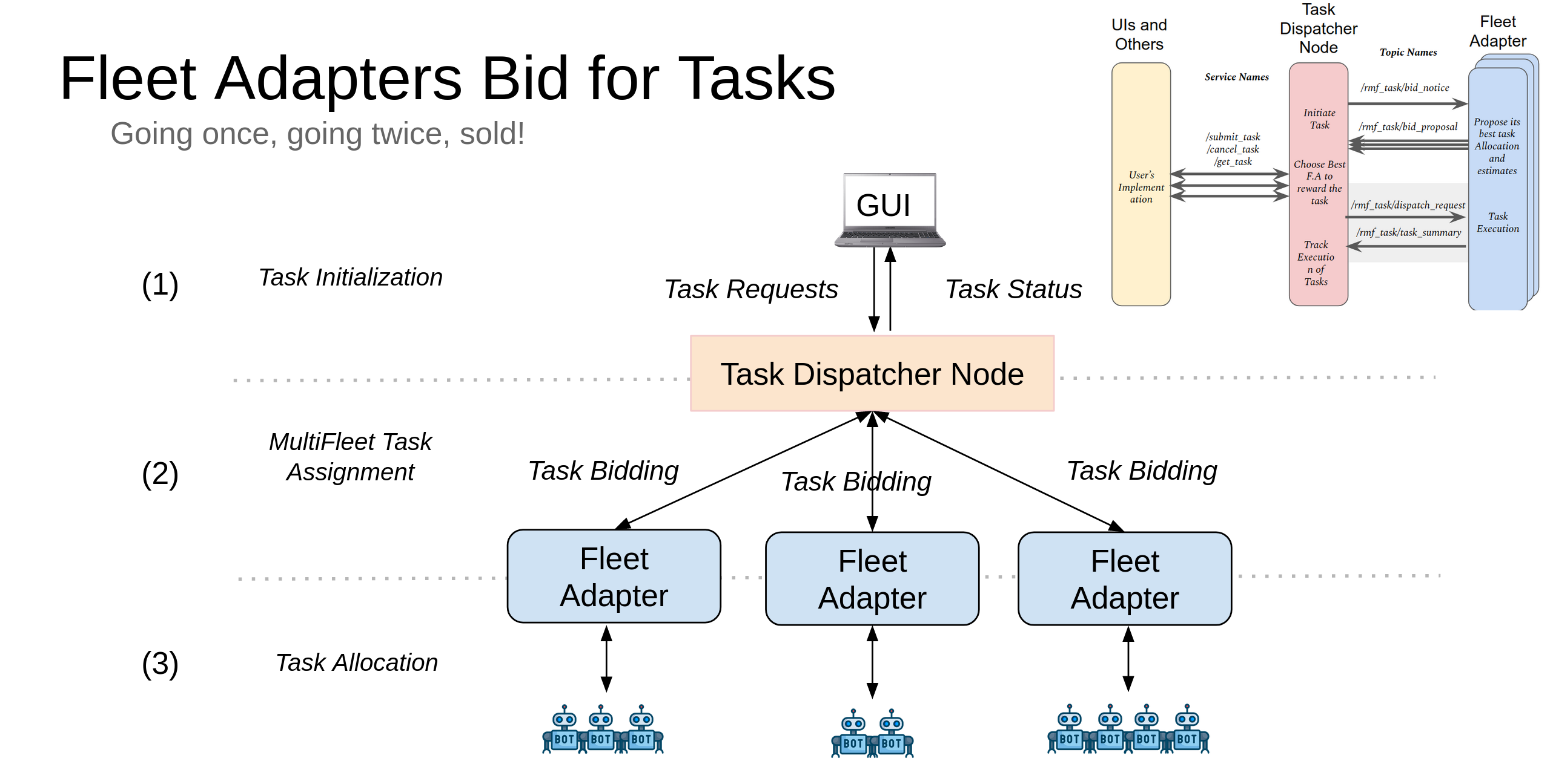 ntask requests acrossmrobots while factoring in the battery drain for the robots. Charging tasks are automatically included in the plan such that robots will head back to their chargers to recharge before continuing with the remaining tasks.rmf_task::requests::...)rmf_task::agv::TaskPlanner: API for solving task allocation problem. Containsgreedy_solve()andoptimal_solve()methods. (With caching, theoptimal_solve()method has comparable run times with thegreedy_solve()method and produces solutions with lower costs)rmf_fleet_adapterfull_controlexample updates the RMF schedule with the itinerary of waypoints in the docking path of a robot in docking modeFleetUpdateHandlesubscribes tormf_task/bid_noticetopic to receive a new task request to accommodate into the robot's schedule. A proposal is computed and submitted viarmf_task/bid_proposalto the dispatcher node. When aDispatchRequestmsg is received viarmf_task/dispatch_request, the schedule of the robot is updated with the previously computed proposal.set_task_planner_params(),set_recharge_threshold(),accept_task_requests()functions to FleetUpdateHandle API.update_battery_soc()andget_participant()methods to RobotUpdateHandle API.rmf_task::Requestintormf_fleet_adapter::Taskfor various task requests (ChargeBattery, Clean, Delivery & Loop). These are found insrc/rmf_fleet_adapter/tasks/WaitForChargephase which finishes execution when the battery soc of the robot reaches/exceeds an expected percentage.rmf_fleet_msgsDock,DockParameterandDockSummarymsgs to propagate information on the docking paths for fleets. Presently, amock_dockernode publishes this information via adock_summarytopic which the fleet adapter subscribes to.rmf_task_msgsBidNotice,BidProposal,DispatchRequest,TaskProfile,TaskTypemsgs which are used during the bidding process.rmf_task_ros2Summary of Dispatcher framework:
