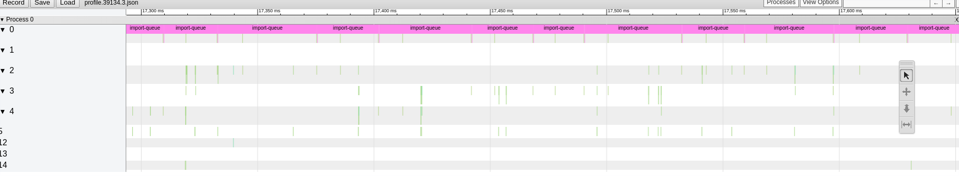 Each block represents a task being polled. Here we can see the the import queue monopolizes an entire thread (unsurprisingly, this is while syncing). The little green lines are networking and telemetry sockets being polled. They are normally rectangles, but they are too thin in this screenshot.