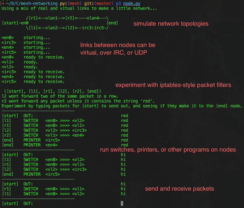 Each node accepts a list of links that it is connected to. All the nodes on one link work like a broadcast ethernet. You can visualize it as a bunch of serves connected to eachother using ethernet cables colored red, green, blue, and purple. Except the red link is actually a real link, allowing you to test your nodes over wifi, bluetooth, or any other hardware interface. Green, blue, and purple allow you to simulate branches of the network on your local computer in order to test topology. The cool part about this is that it allows you to simulate a complex 350 node network using a couple of laptops connected with an ethernet cable or wifi. To view the code for the class Node, check out node.py