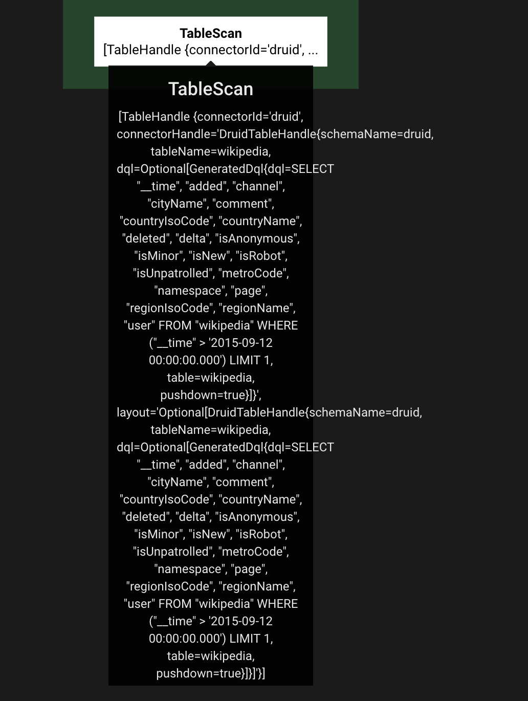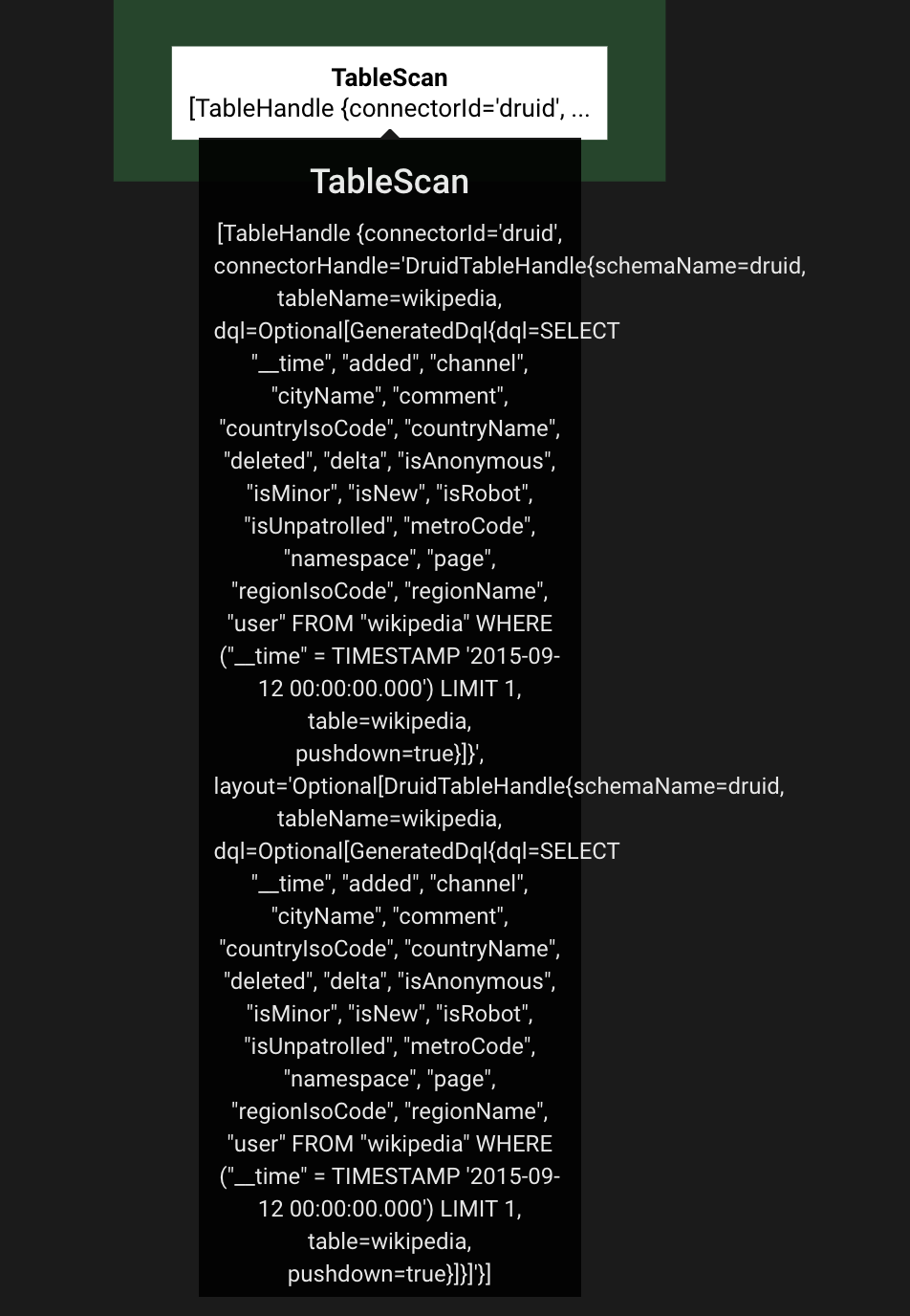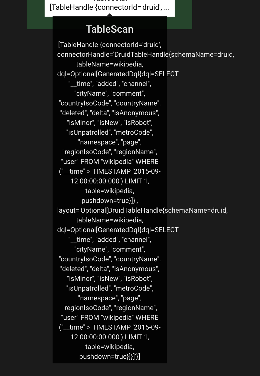 SELECT * FROM druid.druid.wikipedia where __time = timestamp '2015-09-12 00:00:00.000' limit 1;