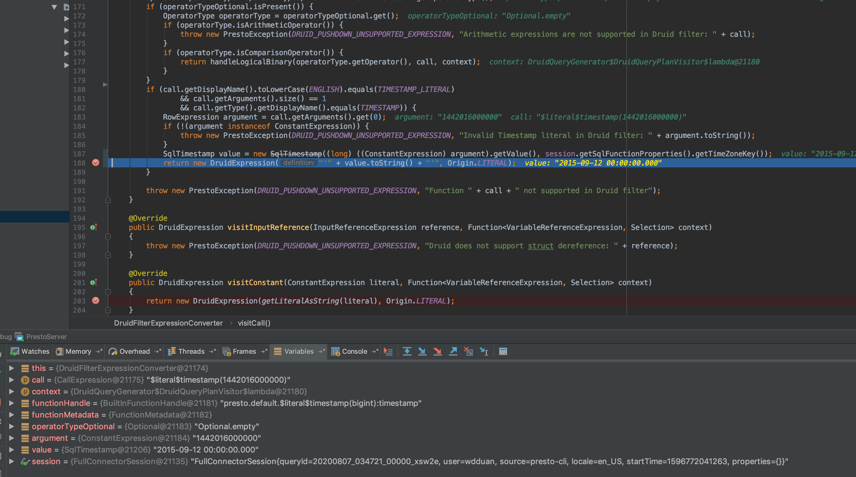 Because for the call 'greater_than(__time, timestamp)', it will go through line 177. And the second argument of this call is a constant which will go to the 'visitConstant' method and then call the getLiteralAsString
