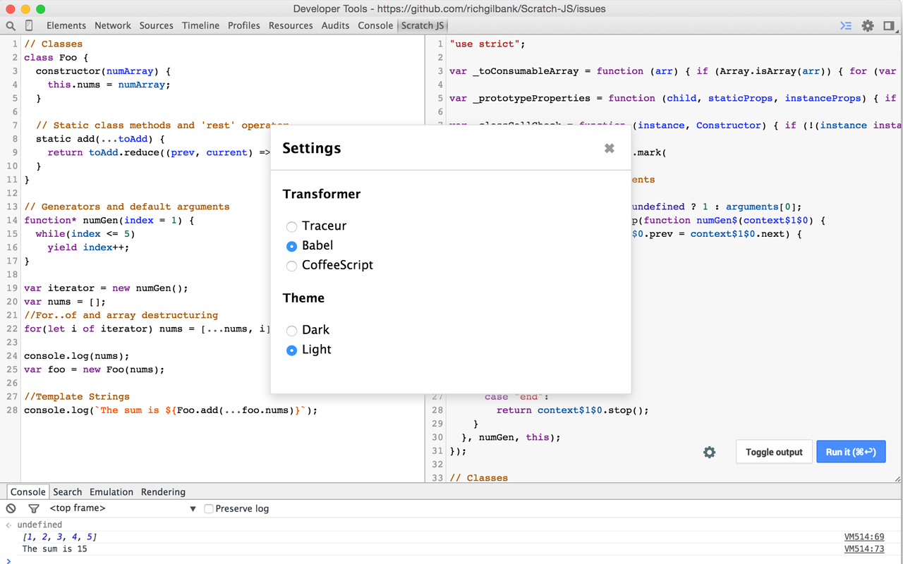 Both Traceur and Babel already have their own REPLs. Why make a Chrome extension? For me it was just the convenience of being able to read a blog about a new feature or syntax and try it right there while I'm reading the article. Pop open the DevTools on the side of the page and give'r.