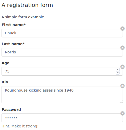 After a good night of sleep, I have to agree... what the hell was I thinking :) Though we still need to expose a way to distinguish bewteen blanking and clearing (or resetting) a field value, as it strongly impacts the resultling submitted data. It's a hard problem to solve wrt UX, and this was my first attempt at tackling it, but there's obviously more work to be done. Meanwhile having an option to enable these buttons is a good idea, though that will probably involve a bunch of supplementary code. I really like the idea of having the "simplest" (if we can still use this word with this lib) possible forms. I'll spend some more time toying around with the UI today, to see if I can come with something less cluttered and invasive, something like this maybe (but prettier). |
