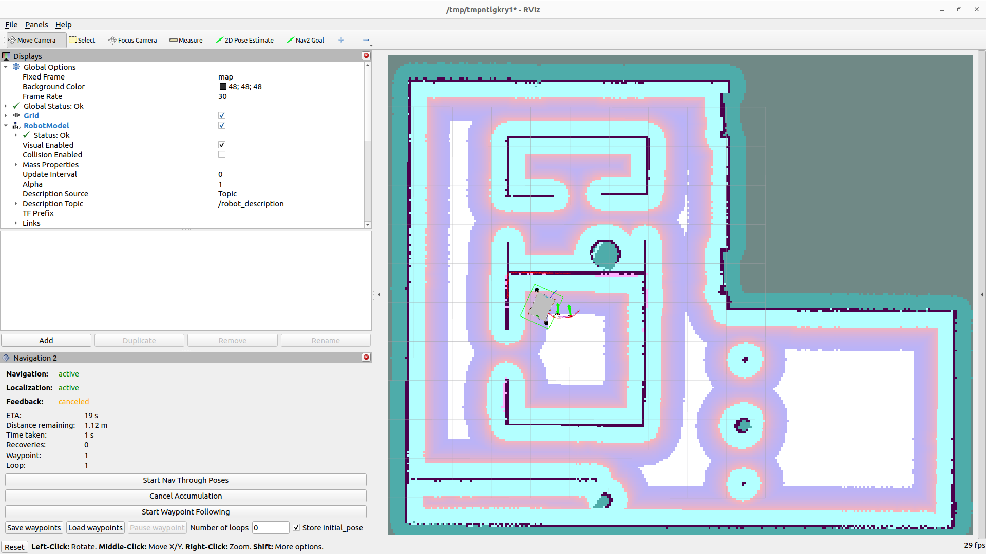 Okay now handling everything in the panel level. Now in the below video you can see that I'm able to select waypoints, set number of loops, start waypoint following and pausing the waypoint following at the middle and resuming it again. Additionally you can also see, there is a status on the panel saying at which waypoint and at which loop the current navigation is happening, also when you press the pause button, you also get a note saying that the last cancelled waypoint is stored, which could be resumed. save_load-2022-10-11_20.00.29.mp4It is not still yet perfect (need to solve edge cases), but just wanted to know, whether will this additional status stuff be interesting for you / users ? what do you think ? (sorry for the poor quality video and simulation performance, for some reason my graphics card is behaving weird in the 22.04, which slows down RViz a lot.) |