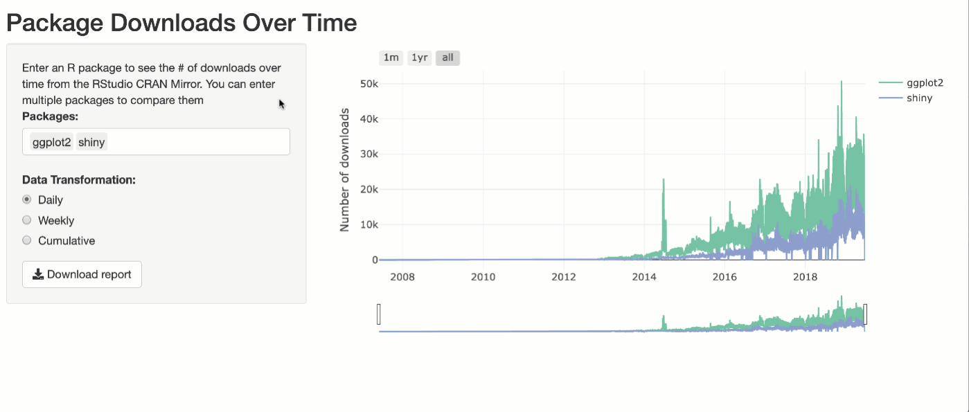 Below is a screen-recording of a Shiny app which allows you to obtain CRAN download statistics for any combination of CRAN packages, look at those downloads using different aggregations, and produce a Rmd-based report with code to reproduce the visualization. This Shiny app is different from most in that it generates R code to reproduce what the user sees in the Shiny app (i.e., notice how the generated report reflects the user's input).