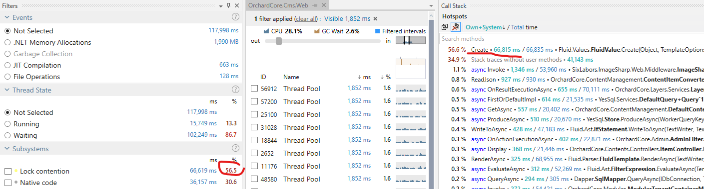 While doing performance checkup in Orchard (load test profiling agency theme) I noticed that there was quite big lock contention problem in Fluid, it originates from #387 where the logic never assigns anything on cache miss thus making the locking and looping happen every time for types like