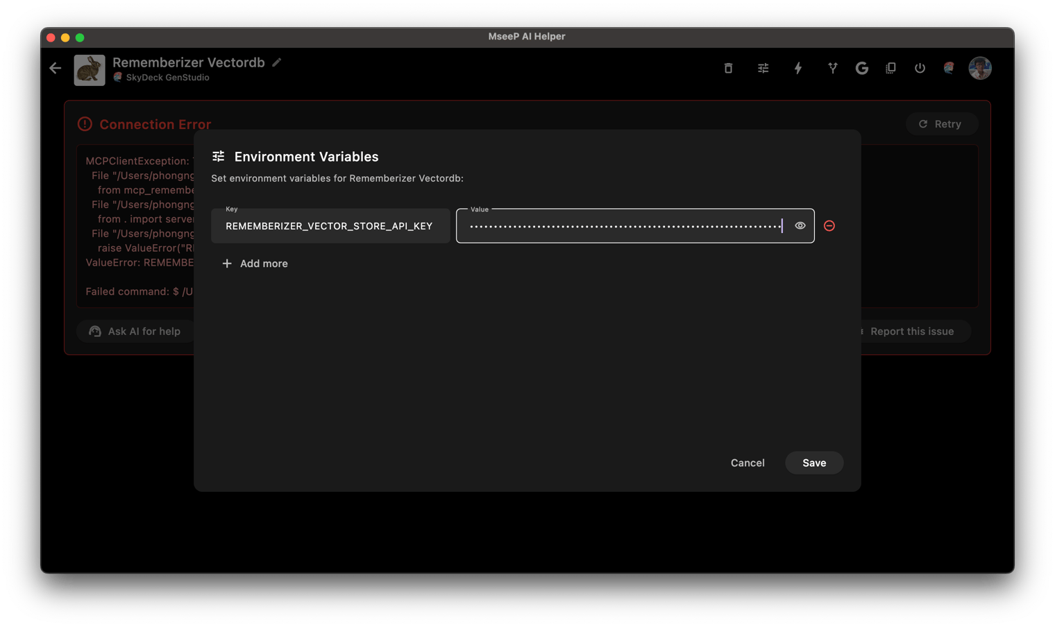 Add the env REMEMBERIZER_VECTOR_STORE_API_KEY