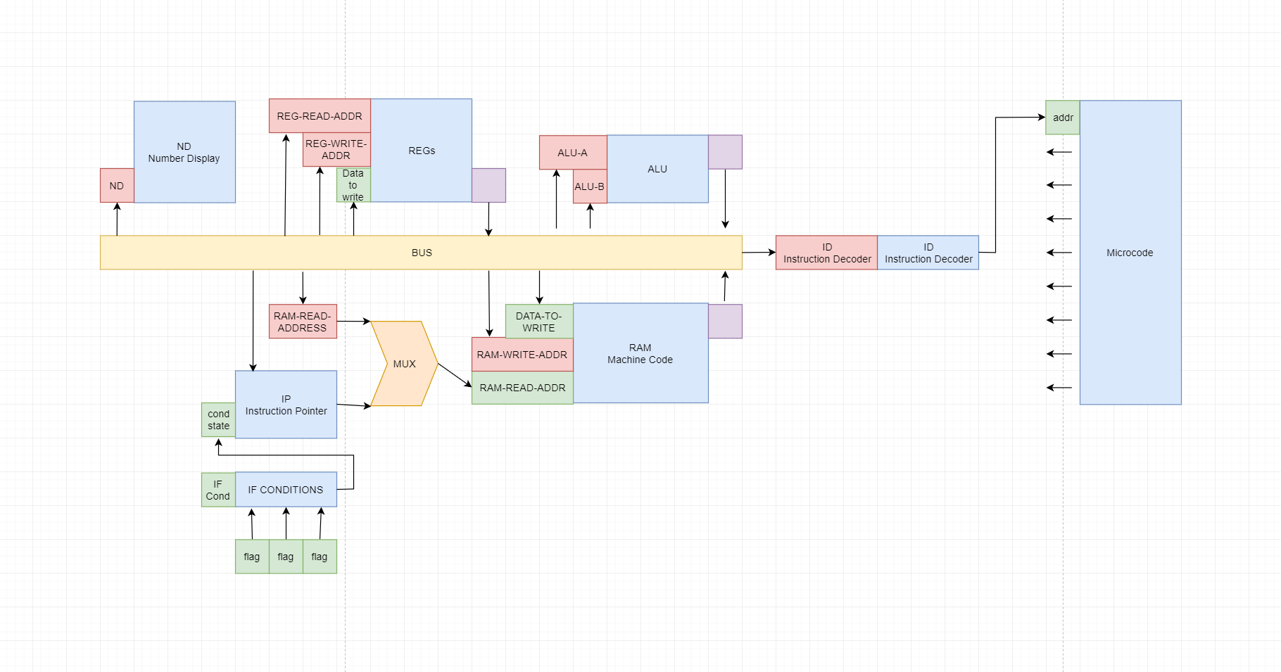 Red: register controlled by micro code which saves data from bus, and constantly outputs it into the component to it's right