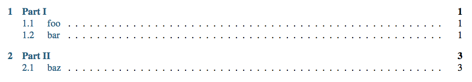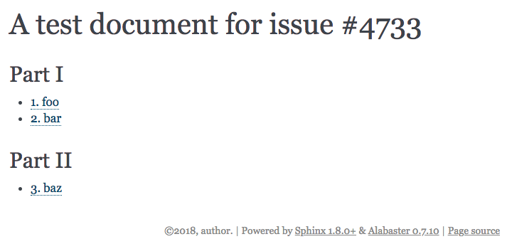 My understanding is that it is due to a lack of support in non-html builders. Up until now, it's only been by coincidence that they match. All this PR does is modify the Even though I numbered the "Parts" in the test case (as "Part I" and "Part II"), don't assume those necessarily carry any numeric meaning. For example, the part headings could be "Prologue", "Statics", "Dynamics", "Glossary", "Index", and "Epilogue". Maybe only "Statics" and "Dynamics" should be numbered sequentially (with |