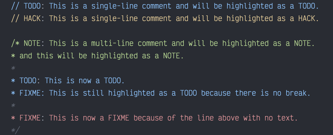 For example, the text in the following comment will all be highlighted as a TODO comment.