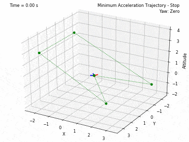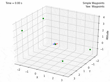 , you can set the desired position and heading waypoints, and the time for each waypoint. You can select to use each waypoint as a step, or to interpolate between waypoints, or to generate a minimum velocity, acceleration, jerk or snap trajectory. Code from Peter Huang was modified to allow for these 4 types of trajectories and to allow for segments between waypoints of different durations. There is also the possibility to have the desired heading follow the direction of the desired velocity.