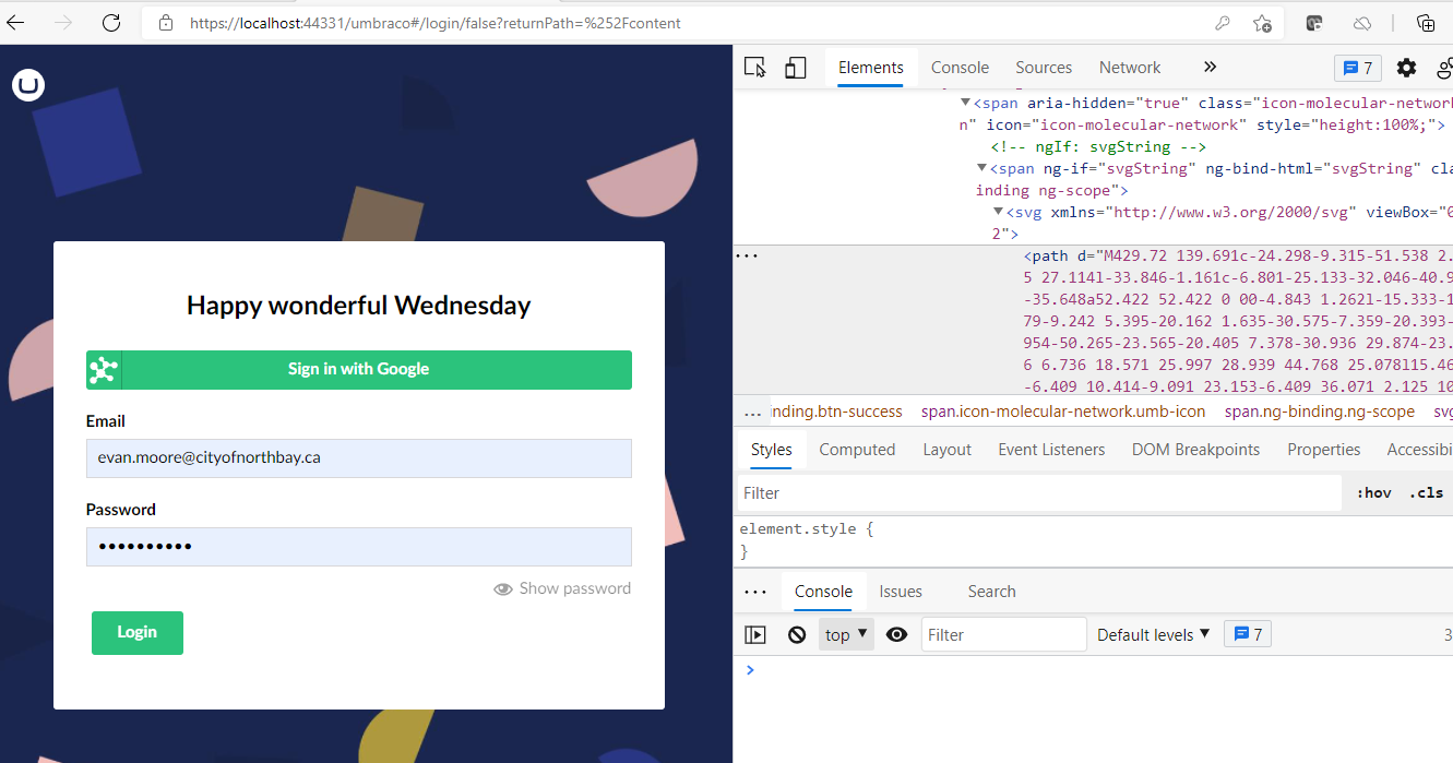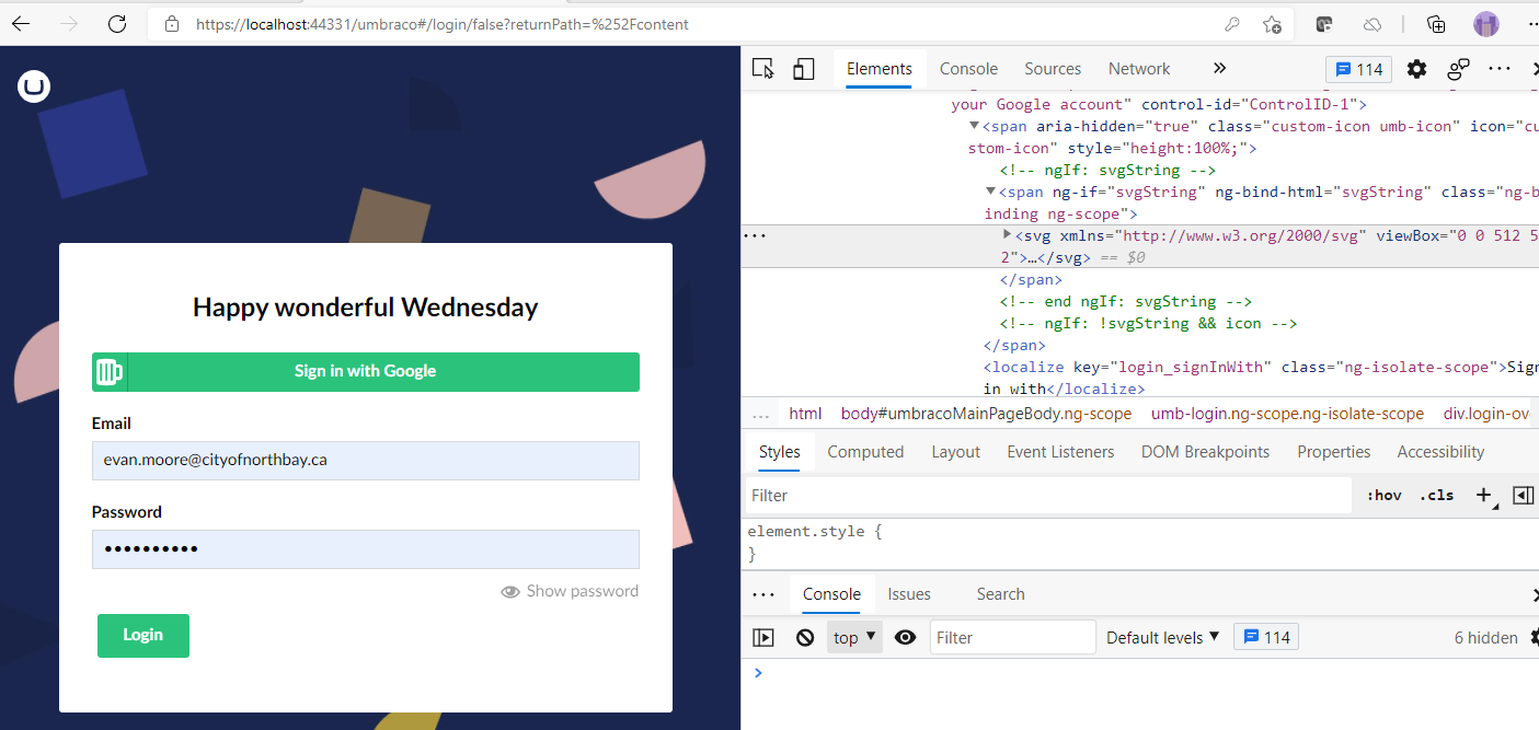 Thanks @bjarnef, configuring the external provider with icon-molecular-network did use an SVG. For reference this is how I've configured it: I've also tested with a custom icon placed in ~/App_Plugins/MyPlugin/Backoffice/Icons/custom-icon.svg: Also if anyone is curious this is how I got the font-awesome icon working. Note this is a little different than v8. V8 assumes a font-awesome icon and includes the fa class, this update no longer assumes font awesome and requires that you include the fa class in the Icon attribute of the BackOfficeExternalLoginProviderOptions. I think I'm also going to submit a separate PR to docs to document how to setup an external login provider in v9. |