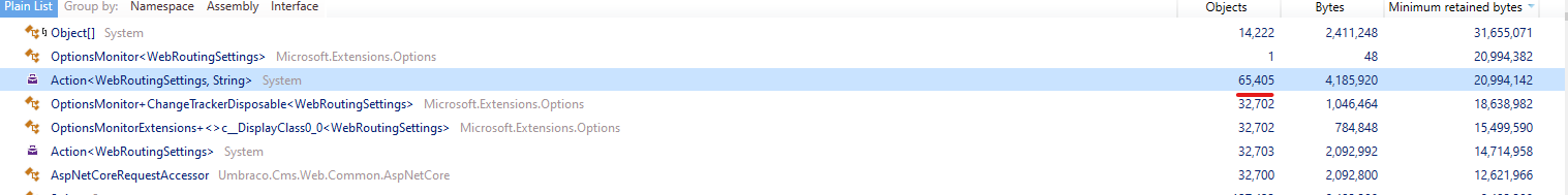 AspNetCoreRequestAccessorwas initialized, and an OnChange even registered on theIOptionsMonitor, this meant that theAspNetCoreRequestAccessoralongside its delegate in theIOptionsMonitorwould never be GC'ed.To add insult to injury, since the notification handler is transient, the