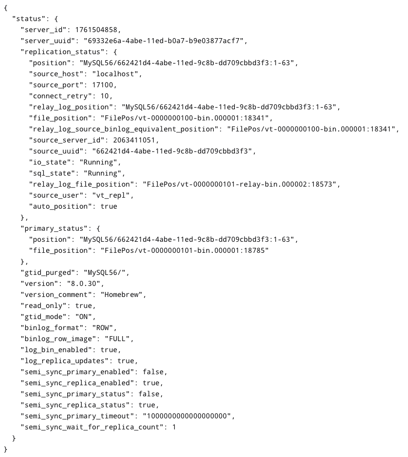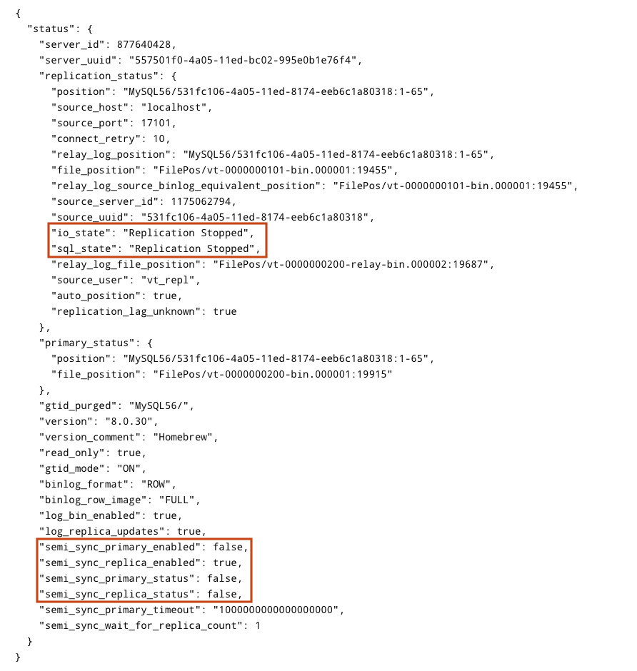 Full Statustab in the vttablets in VTAdmin which shows the full replication status of the tablets.In this output it was noticed that the IO state and SQL state are printed as integers (because they are stored as an enum), instead of any meaningful output, so it becomes hard for the users to read this data unless they are familiar with Vitess internals on how the enum works.
