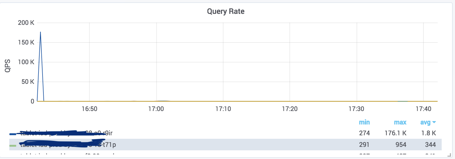 QueryCounts) are incorrect and unreliable for our keyspaces with large amounts of bulk inserts. This is because the TabletPlan cache evicts frequently and the query stats are driven out of the TabletPlan cache. So, on every given metric scrape, the plan in question is not reliably in the cache (and therefore its stats are not there) to be scraped, leading to false gaps in metrics that Prometheus struggles to computerate()s off of.This results in graphs that look like this (out of Grafana/Prometheus), when we did not actually have those spikes in query rates on that tablet: