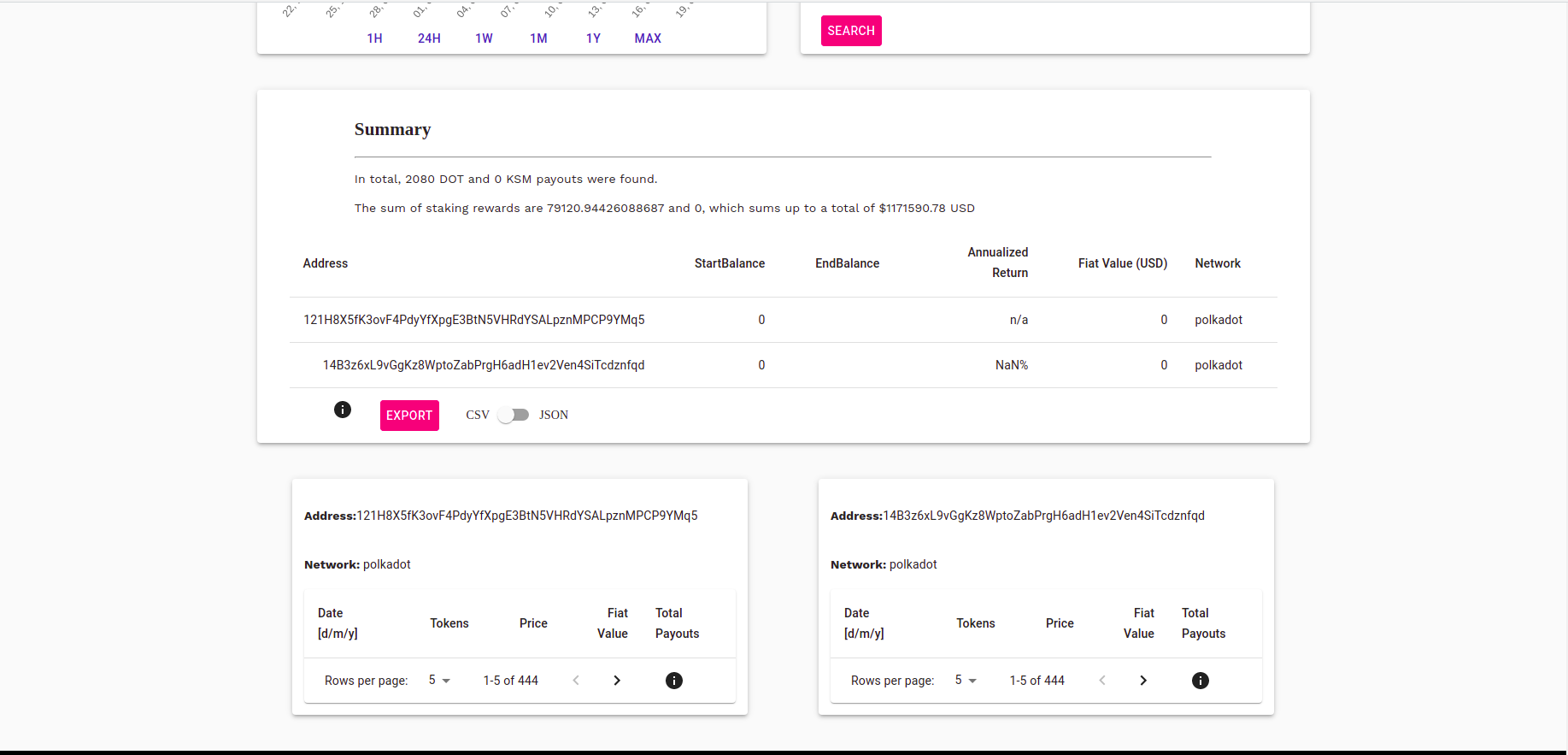 Btw, it seems the service has some issues, it does not find any rewards for addresses that I find rewards for with my script. Could you check, @jackson-harris-iii ? |