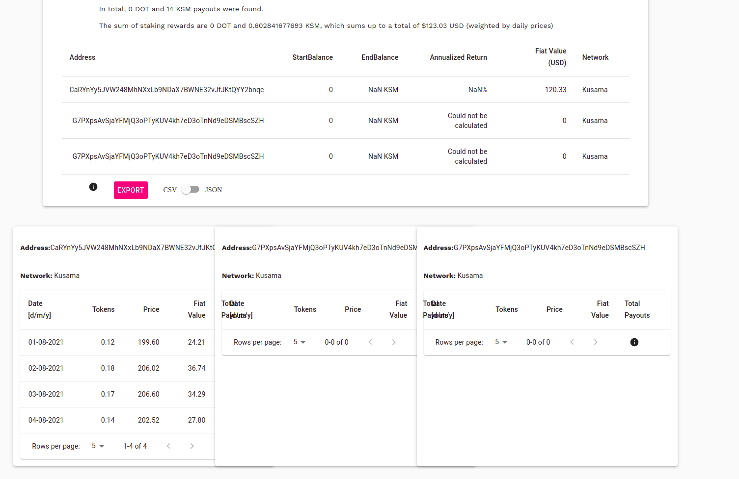 - The output text is missing the token ticker “DOT” and “KSM” after the balances. Also, please add the note that the fiat value is weighted by daily prices.