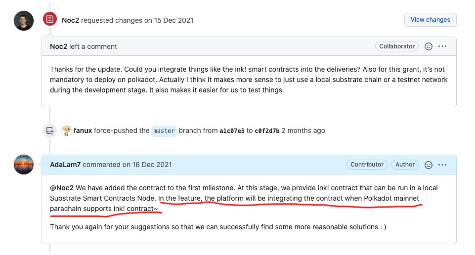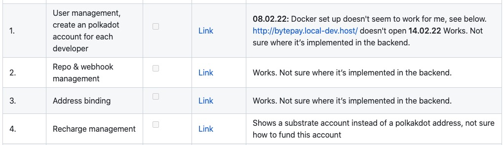 Sorry for the delay here and thanks for the changes. I just updated my evaluation. I was now able to test the docker version, but it would be nice to also have a way to set up everything locally. For example, the docker version showed me a substrate address, but I’m not sure how I can connect to the chain and fund this substrate address for testing. Additionally, I found it strange that the live version already works with DOTs. This means the smart contract is not used or can you point to the place where it’s integrated. Also where in the backend is the data stored and the address generated? Could you share links to the actual implementation with me? Thanks!