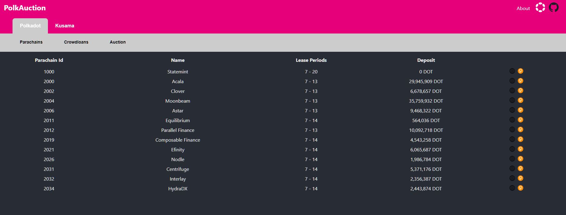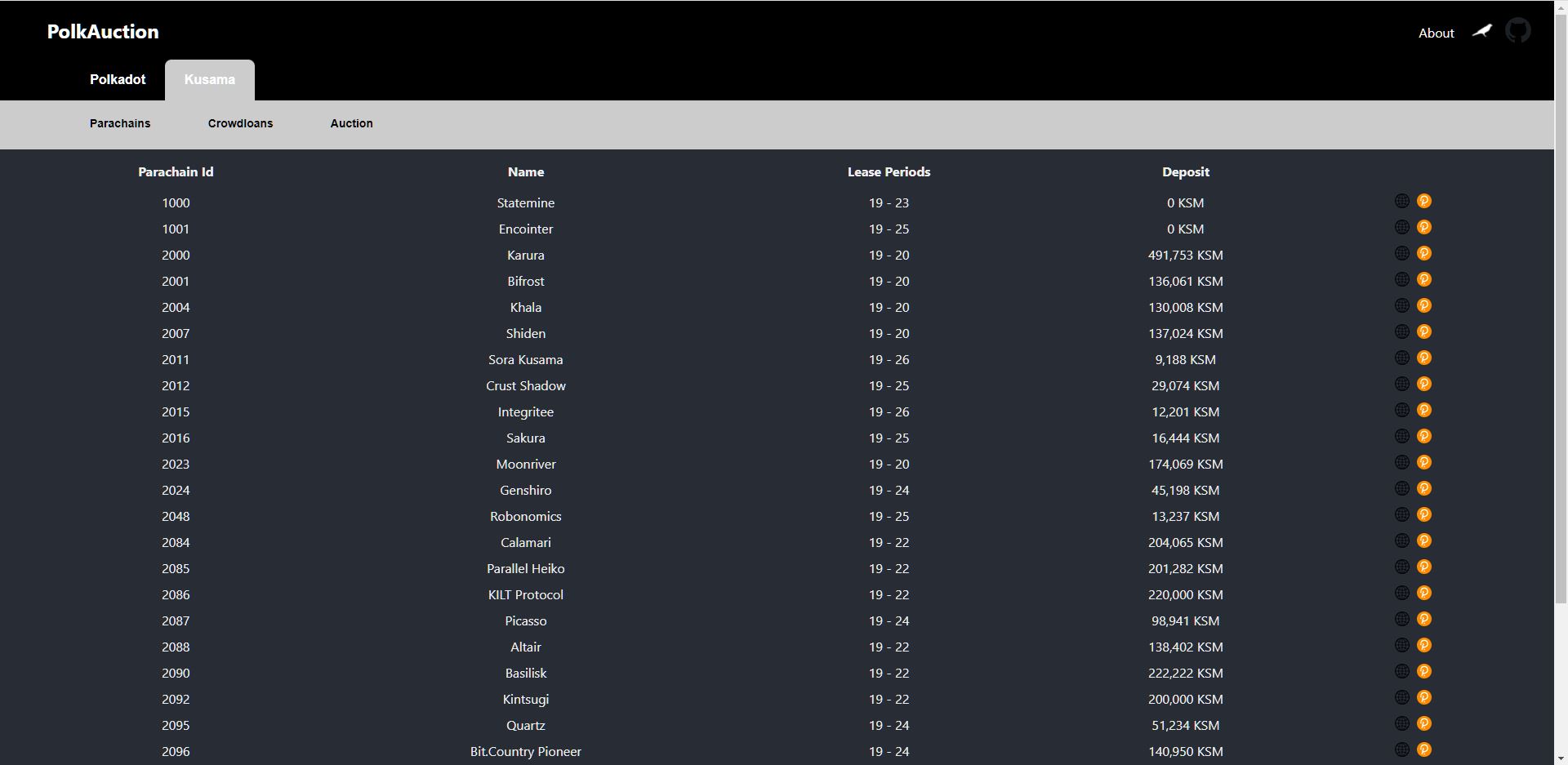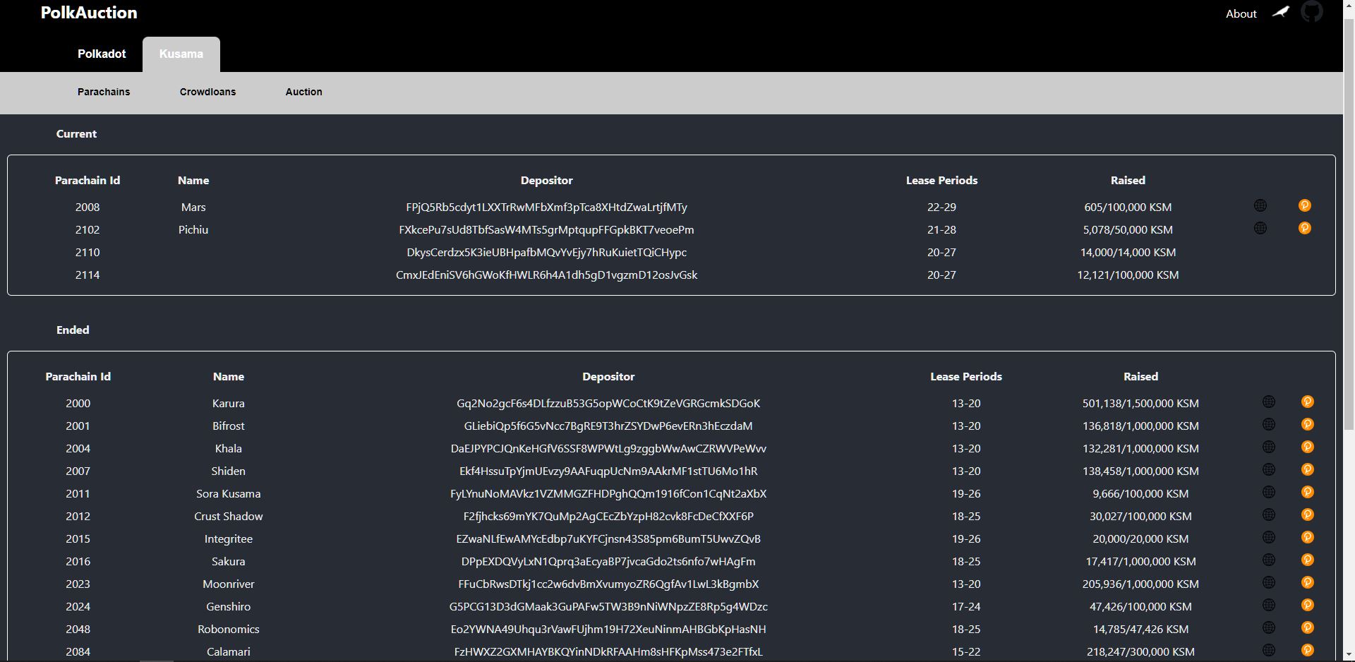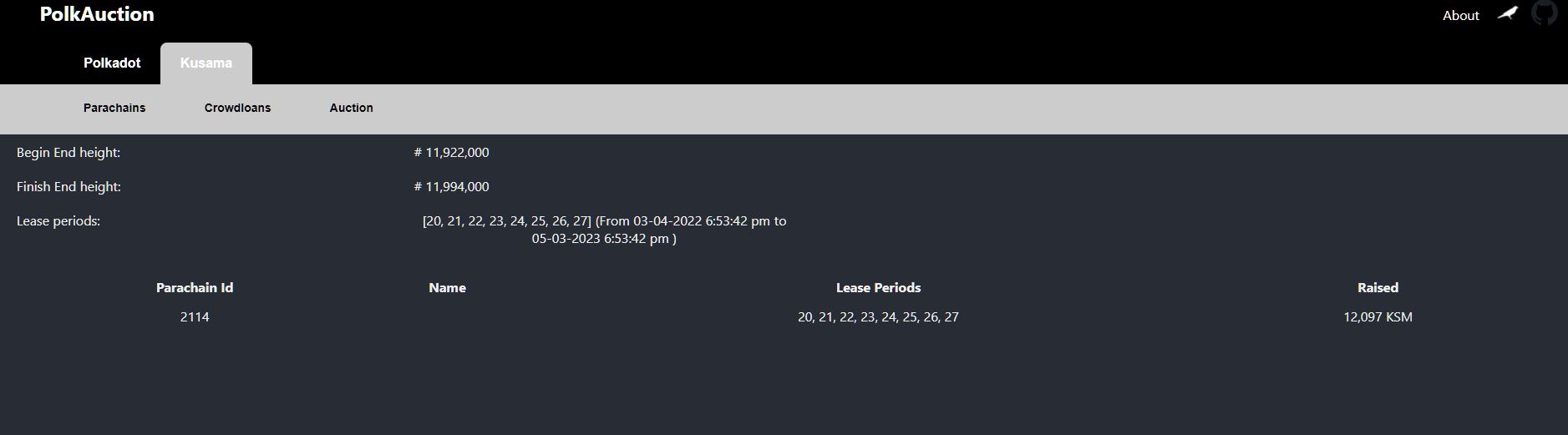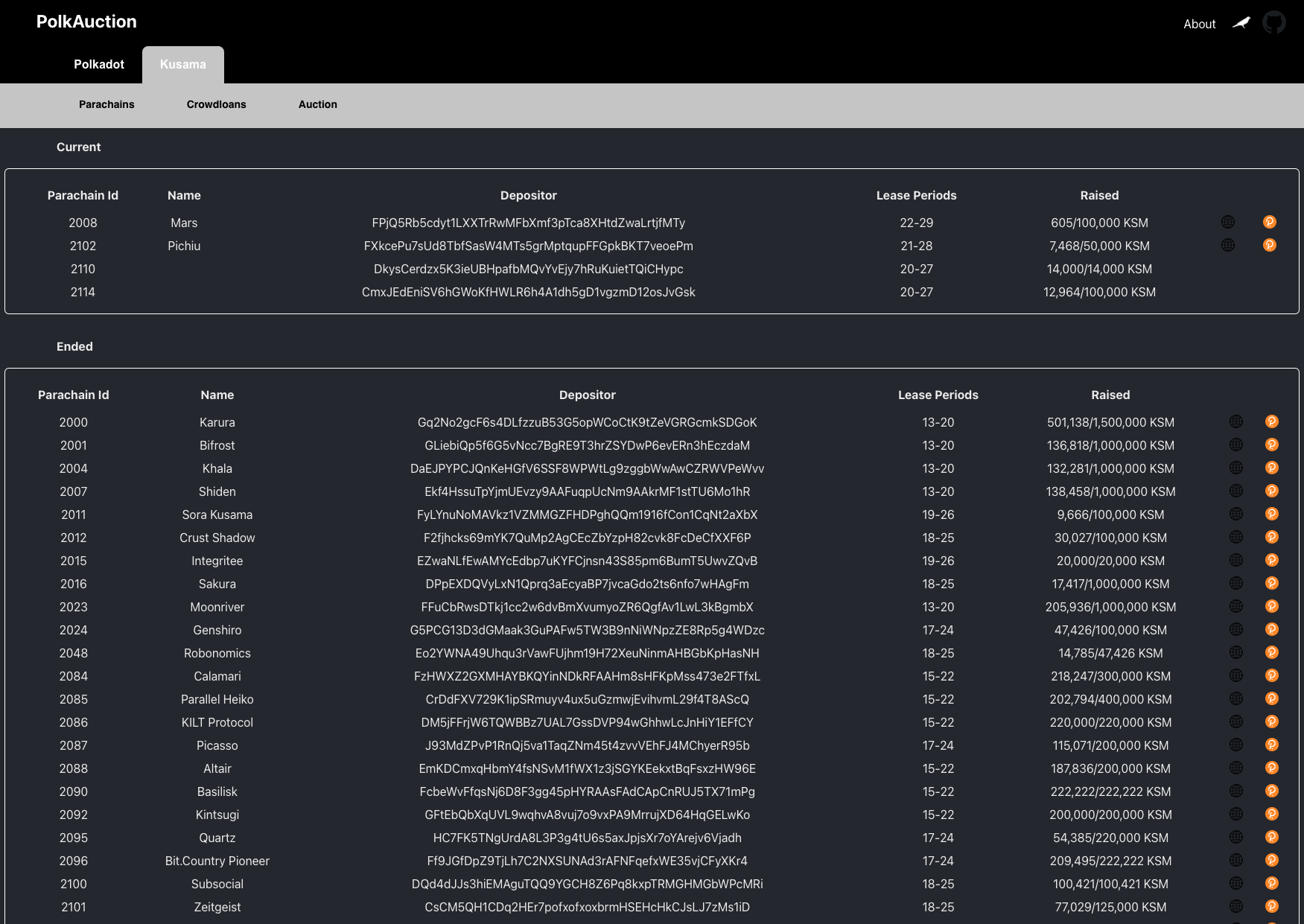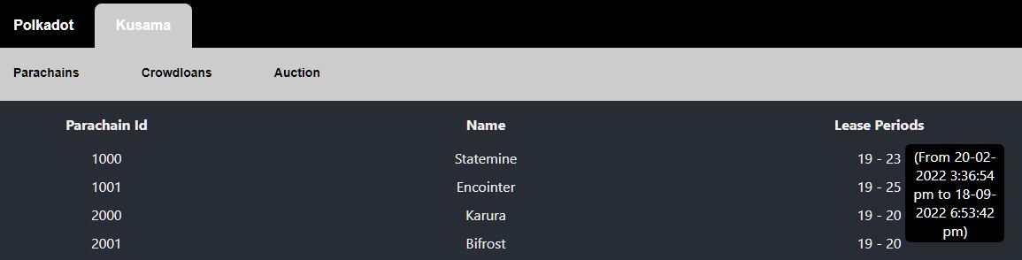 Hi @takahser , No problem. Sorry to hear you couldn't see the API calls results in the UI. I'm not really knowledgeable when it comes to network redirection. But could changing the api url in the .env.prod file help ? Because I find it a little sad you went into so much trouble with this delivery and yet not be able to view the end result. Anyway, here are a few screenshots : Kusama Parachains with hovering the lease periods : If you need more screenshot/information, let me know ! |