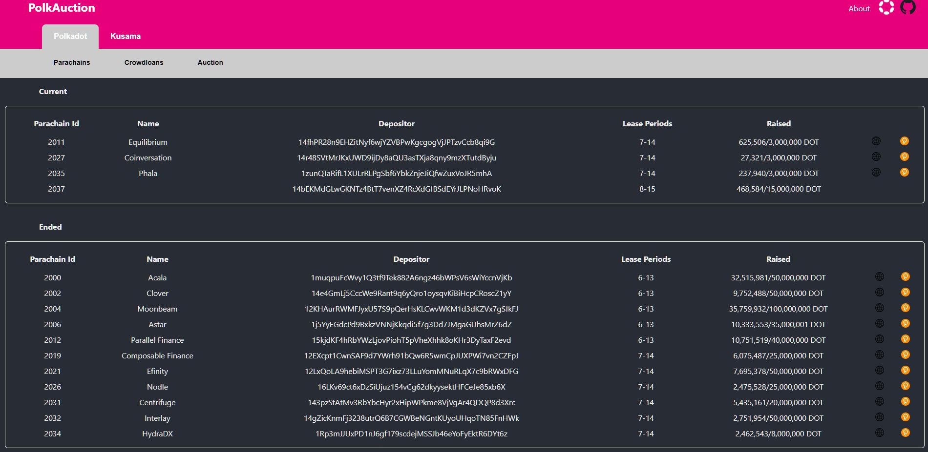 Hi @takahser, So I've resolved the issue regarding the docker build (and indeed, the command docker-compose works only if the previous build command works). This was due to the new parcel version. I've downgraded it. I've also implemented the suggestion regarding the header's relay chain selection. I've fix the warnings related to key of list's elements. I've added a FAQ section in the about page. (Not in the evaluation) : I've fixed a bug when data for a selected chain was loading (pending request) and the user switched chain, the data displayed were from the previously selected chain. So it is now fixed. The request also now use a cache mecanism because : parachains, auction and crowdloan are not changing too much over short periods of time and because the queries (especially for crowdloan) were taking several seconds, which can be annoying. Finally, I cannot replicate the other two errors You can pull the head of the default branches for both repositories to continue your evaluation. |