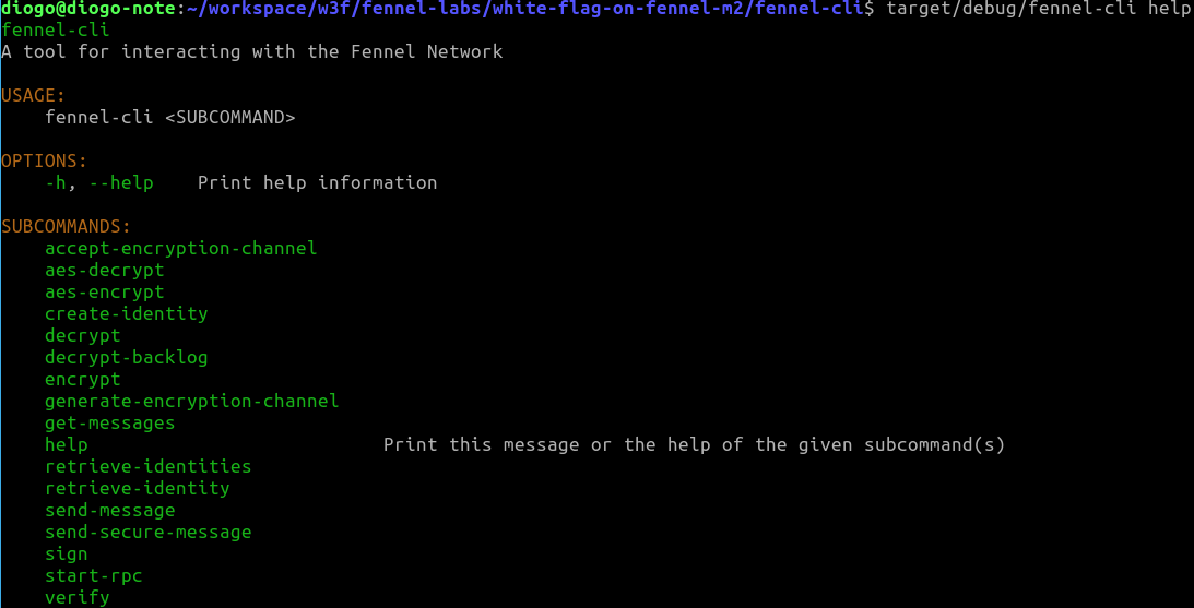 @isaacadams and @Romulus10 lets try to clarify the CLI topic. When I refer to verify the CLI is regarding the deliverable 2 of the Milestone 2. This deliverable 2 of M2 is specified in this way in the grant proposal: "The Fennel command line client will be updated with full support for the full range of features provided by the Whiteflag Protocol. At the conclusion of the first grant, fennel-lib included encode/decode support for authentication messages and the basic set of Whiteflag message reference codes. This expansion will include all reference codes as command-line options for all message classes with some intelligent automation (e.g., if an authentication message has already been sent the interface will disallow another authenciation message from being sent until the previous is revoked), as well as full integration of fennel-lib's cryptography functions with our Whiteflag implementation.". For me, it is clear that the deliverable 2, as stated in the grant proposal, is an extension of the CLI feature. I also could see the commands in the CLI (see the image bellow), but I don't have examples to test it. Lets check if we are talking about the same deliverable. Are the scope of deliverable 2 included in the delivery of M2? If it is, how can I test it? If not, or if it was developed in a different way (like RPC only without the command line interface) you can submit an amendment to the contract explaining the situation and we will evaluate that. |