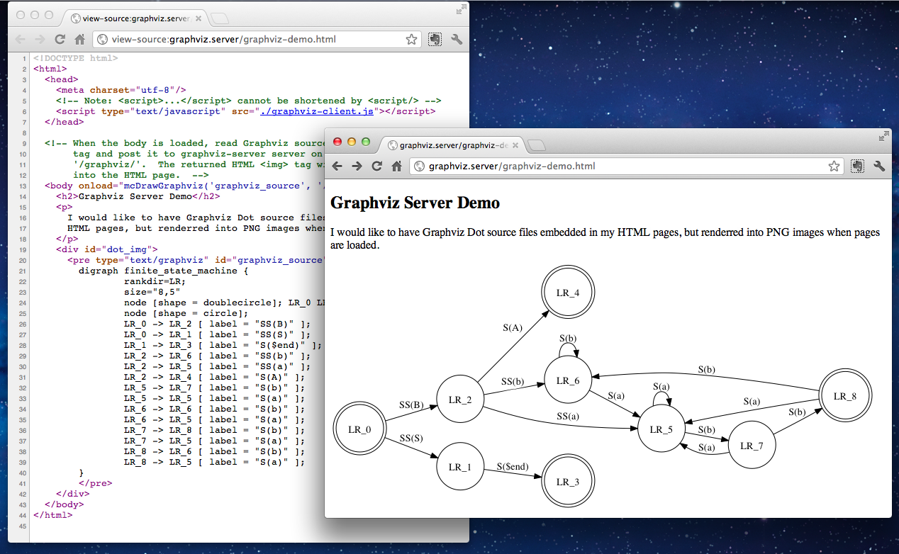 Recently, the team I am working with is focusing on documenting a complex online advertising system we developed. As you know, in design docs, we would have figures like system architect, data flow and etc. As programmers, we don’t want to draw if we can code. So it would be great to have Graphviz dot graphics embedding in our documents in HTML format.