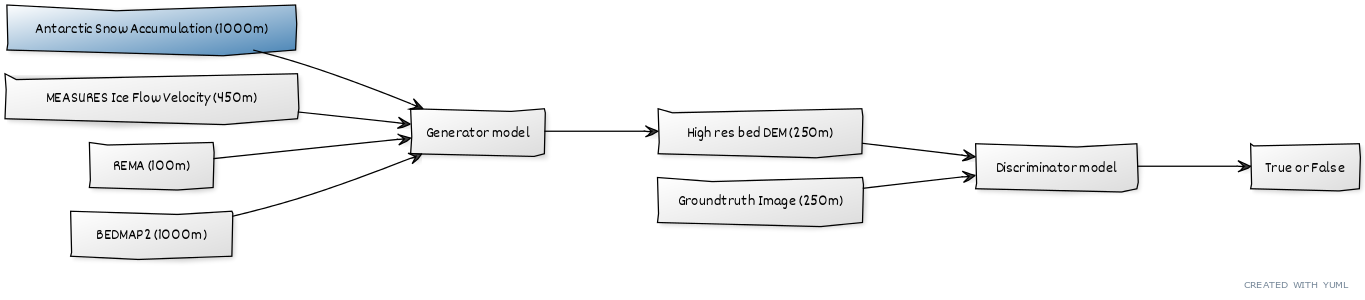 Our DeepBedMap Enhanced Super Resolution Generative Adversarial Network's Generator Model now takes in an extra W3 input - Antarctic Snow Accumulation! Updated functions in srgan_train.ipynb and deepbedmap.ipynb for this, plus some of the markdown documentation in srgan_train.ipynb (especially the YUML figures). Unit tests have been updated, and we've included the new W3 Antarctic Snow Accumulation dataset in a new upload to the quilt 'test' package covering the 2007tx.nc grid's extent, changing the quilt dataset hash from df0d28b24283c642f5dbe1a9baa22b605d8ae02ec1875c2edd067a614e99e5a4 to ad18f48a7f606b19a0db92fc249e10a85765fc5dbd2f952db77a67530a88383d. ESRGAN model trained for 20 epochs only to ensure that everything runs smoothly, and to update the ONNX graph. RMSE_test value is at 100.32 (see https://www.comet.ml/weiji14/deepbedmap/43dfae28dfd340119928387b402ae24b), but of course we can do better than that! It's good to see that one epoch still takes only about 7.5 seconds to run even though we've added an extra W3 input that increases the parameter count from 9088641 to 9107393. Maybe it's because we're down from 2499 to 2347 training tiles, but also perhaps the GPU works faster on a size 128 concatenate layer than 96? TODO fix issue with deepbedmap.save_array_to_grid possibly transferring wrong coordinates when going from numpy.array -> geotiff -> netcdf.