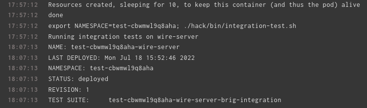 make kube-integration-testwhich is an alias for./hack/bin/integration-tests.shwhich runs this line:helm test --logswill run all tests as defined under./charts/<chart-e.g.brig>/templates/tests/*, then post all logs. My hunch is that tests did not have enough time, so there's actually a timeout; but the error doesn't say timeout, but "can't find this pod I'd expect to have started"By looking at these timings, we can see the last log entry from being done setting up all the non-test pods, it's 17:57, and the first line of the log output from the test pods is 10 minutes (600s) afterwards, at 18:07: