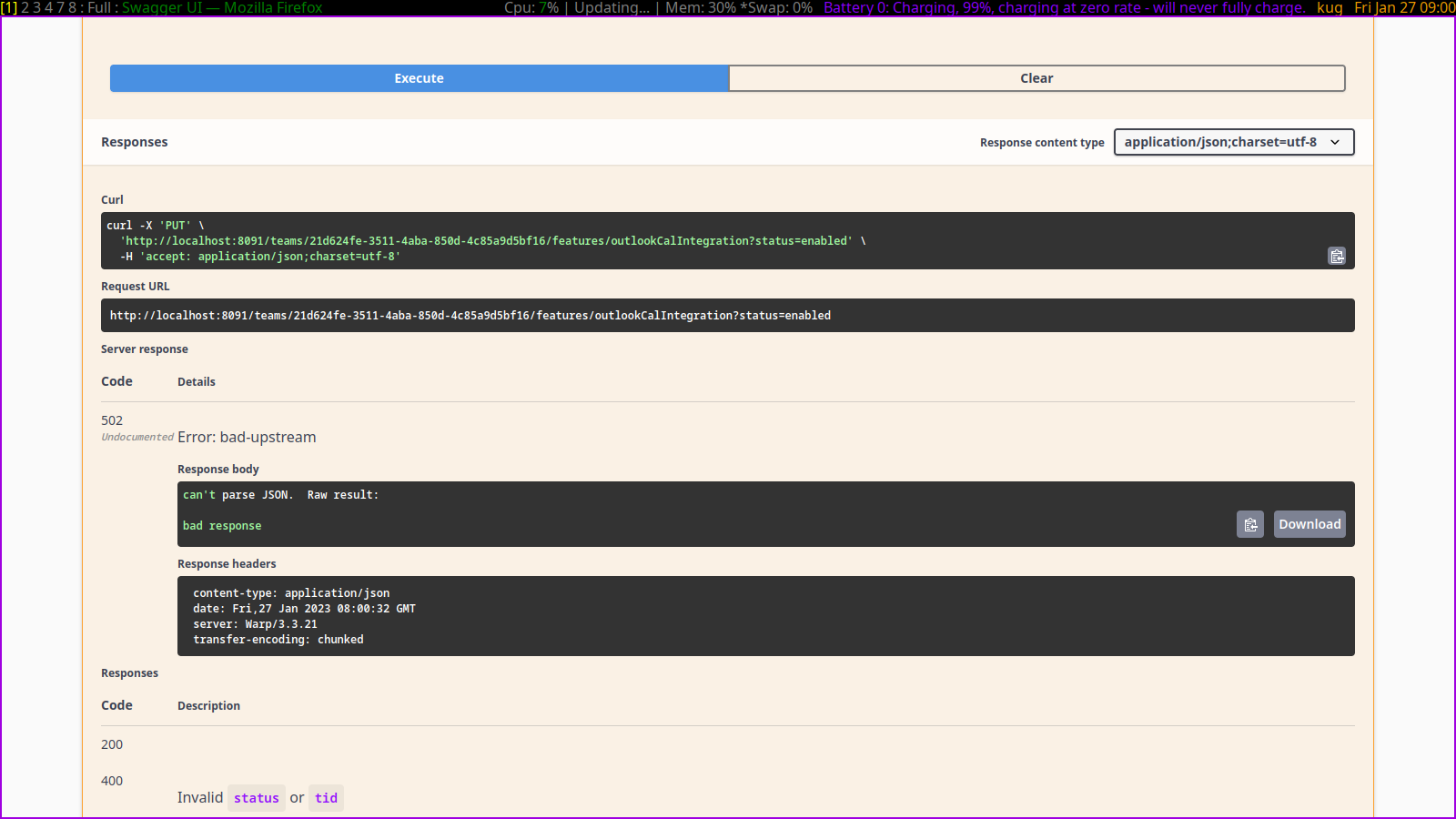 Yes, IMO this has nothing to do with this PR and is a general problem. The error occurs if the feature is locked. If you unlock the feature with curl, then it works. However, IIRC it used to be possible to lock or unlock features via backoffice/stern, but these endpoints have somehow disappeared. Strange. I'd tend to solve this problem in a separate PR. |