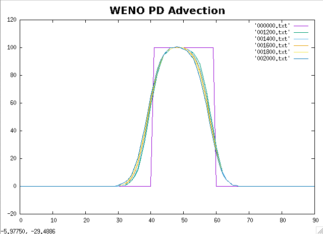 3 (WENO), and 4 (WENO PD) are shown. Every 200 full steps, the square wave should be back in the original location.