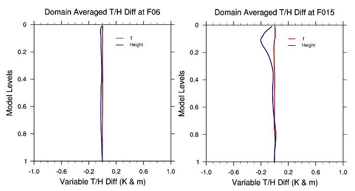 Fig. 3. Domain-averaged temp and height differences at 2 pm and 11 pm. The unit for T is K, and m for H.