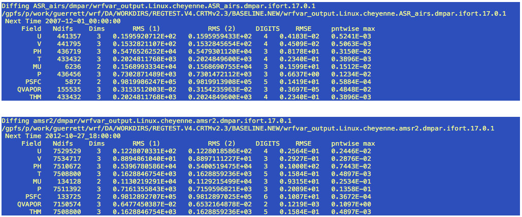 TESTS CONDUCTED: The WRFDA Regression test passes with "match" results except for two of the scenarios, which give the following results from diffwrf: