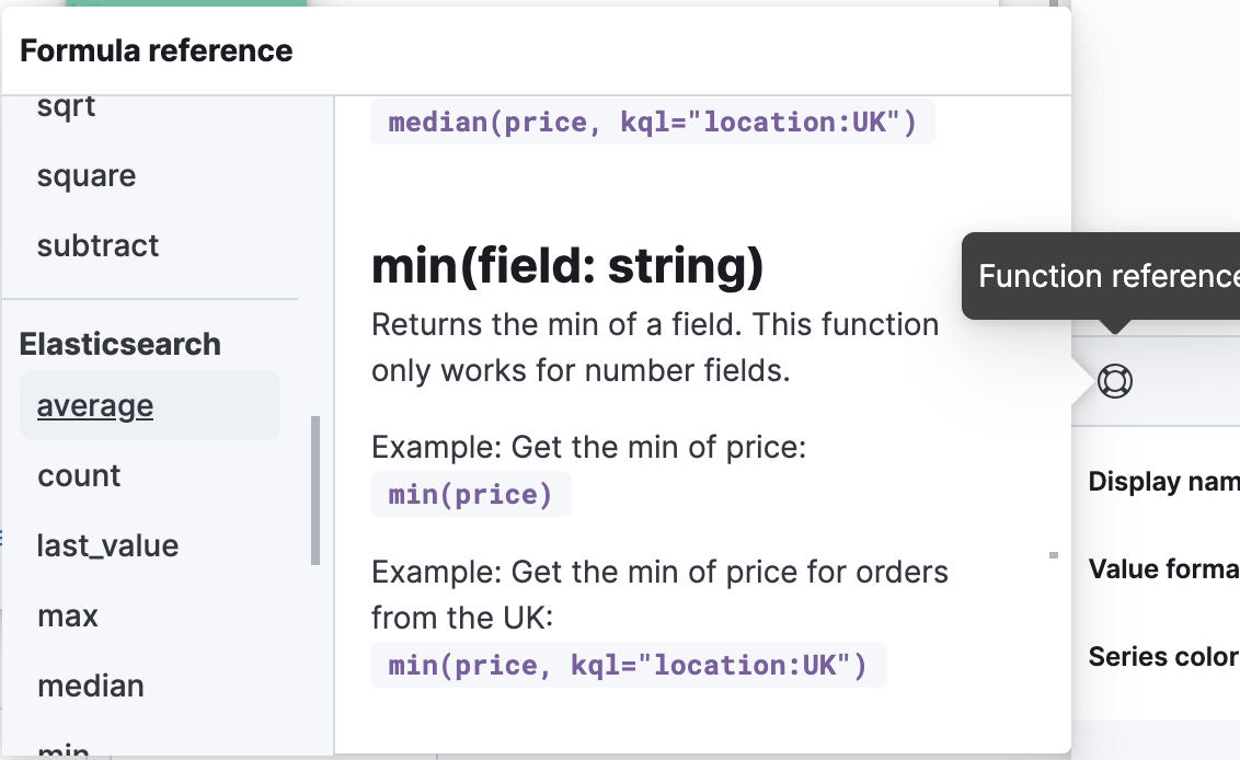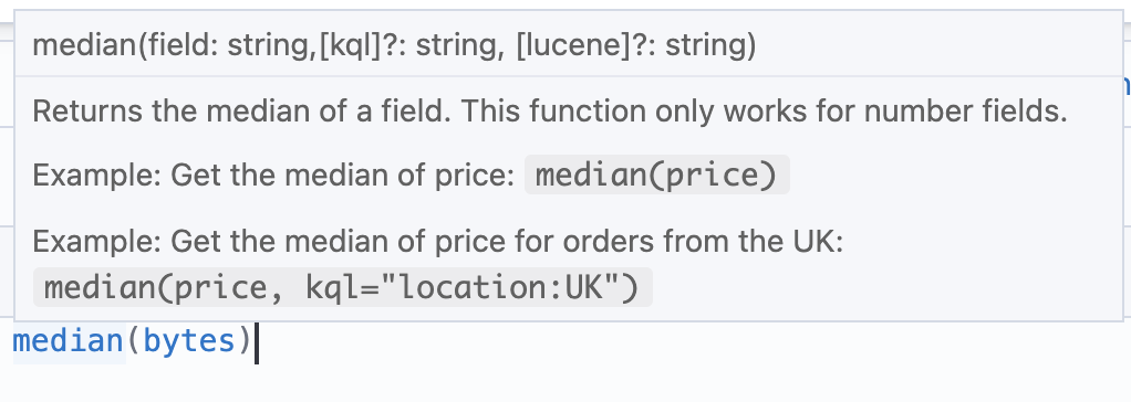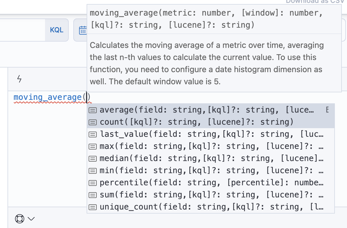 formulaandmathfunctions from the suggestion listkql/luceneextra args for all argumentsmoving_averageis the longest (see the pic below). Others are in the order of 1/2 linescounter_rateHover still shows the whole doc for the function: