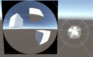 A prefab that concatenates and warps the images from four cameras into one 180 degree fisheye view, projected stereographically.