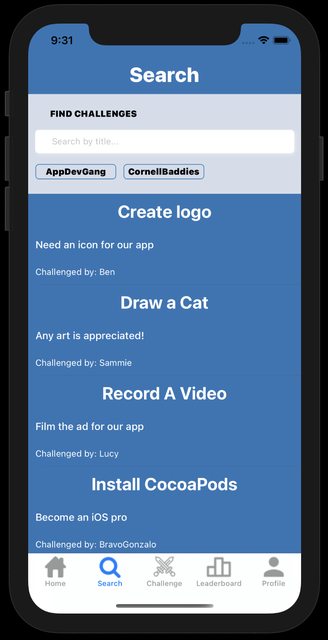 Challenges with friends is an app where you can do challenges, with friends. A player can sign up with a username and password, and login every time afterward from that point. They can then navigate between different screens based on what action they want to take next: look for a challenge to claim, complete a challenge by uploading photo proof, propose a new challenge that another player will claim, or look at their positional ranking on both the global leaderboard and the group leaderboard for whatever groups they are a part of. There is also a profile page where a player can manage which groups they are a part of.
