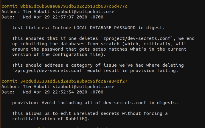 In the mobile repo, we've more or less consistently used the same form for describing "what" in the body (if present there) as we do in the summary line. I don't feel an urgency to make the style uniform one way or another in zulip.git, but unsurprisingly I do like better the style I use. 😉 One reason is that a sentence in the indicative can easily be ambiguous about whether it's describing something already true before this commit (as background) or something newly made true by this commit. In any case we've been pretty consistent in zulip-mobile, and so I'd like to generally maintain that consistency there. |